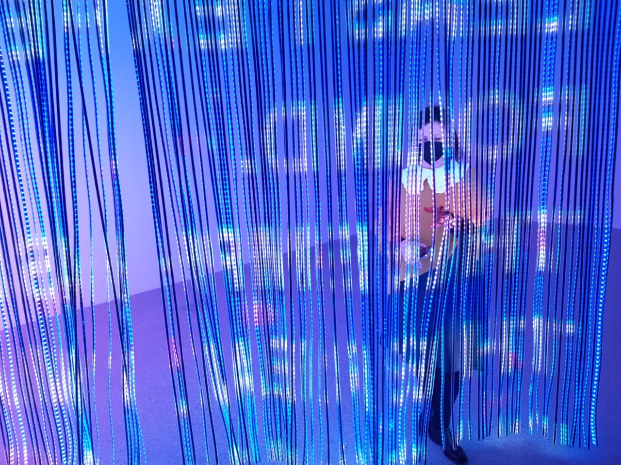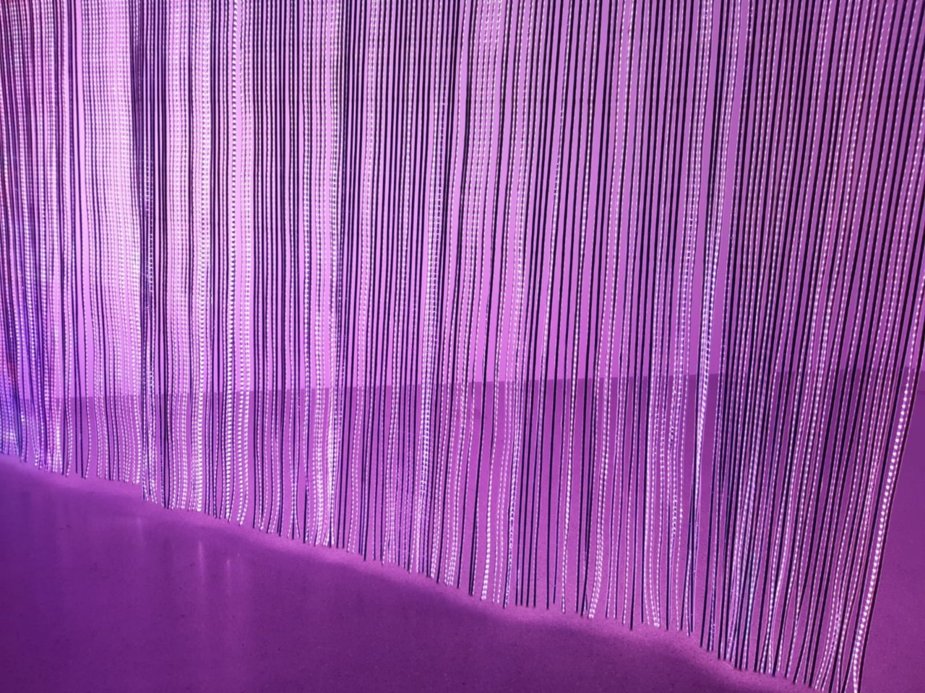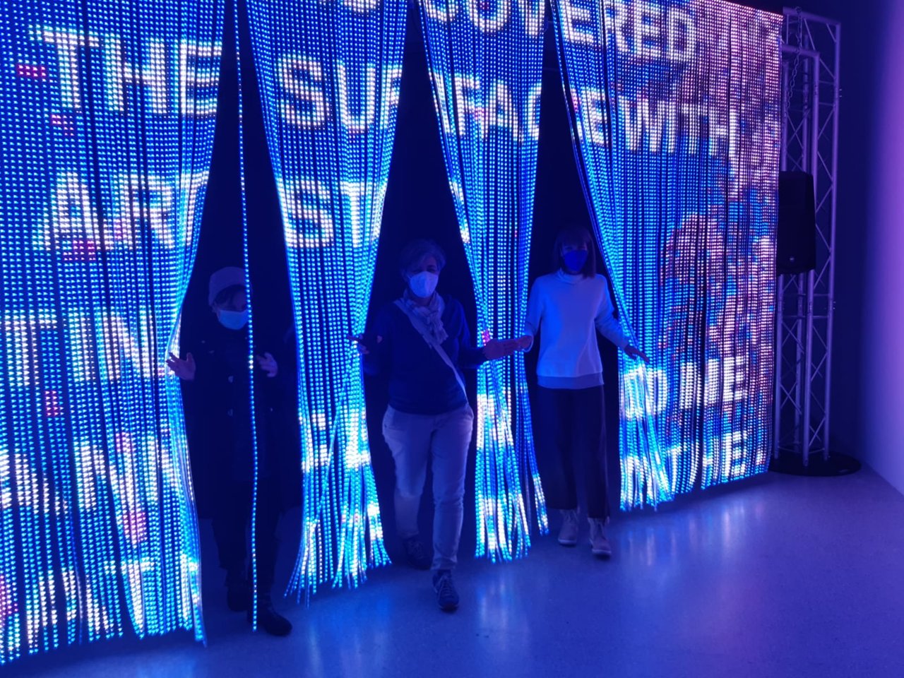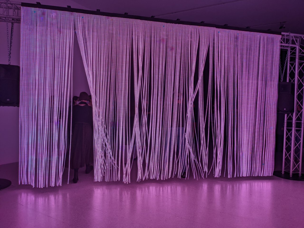 Das Durchschreiten eines leuchtenden LED-Vorhangs, dessen bunte Fläche wie ein riesiger Bildschirm mit fließenden Bildern und Sound bespielt ist, hüllte uns in Träume, Sehnsüchte und Nostalgien. Ein extrem poetisches Werk, das zu sehr Vielem einlädt.