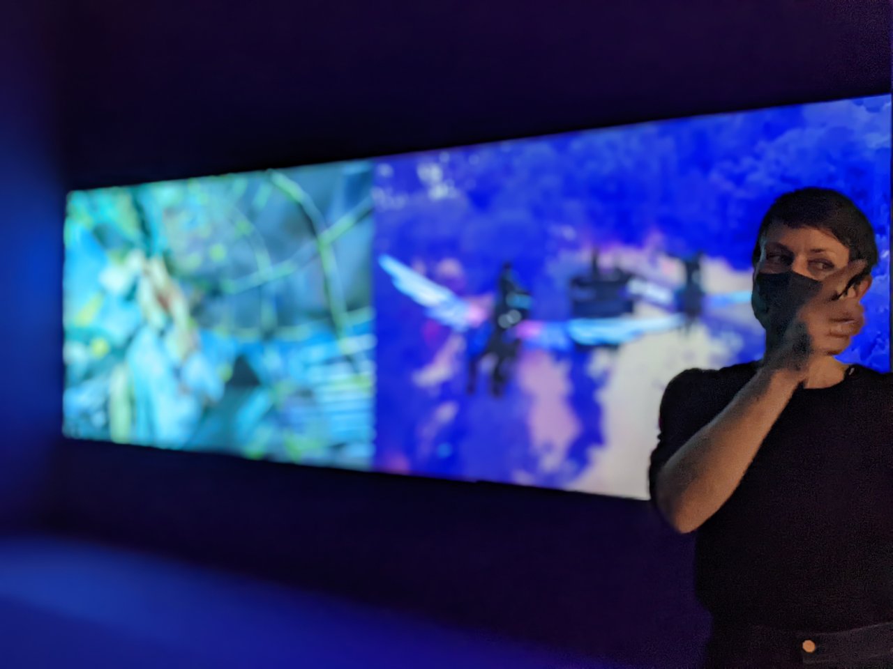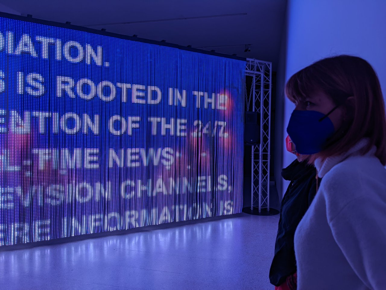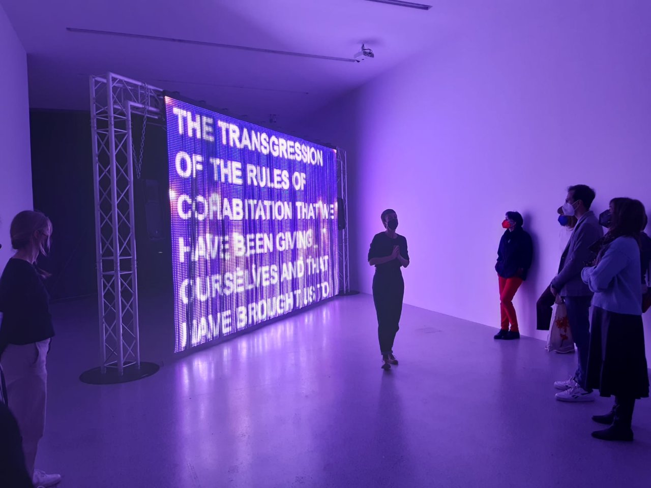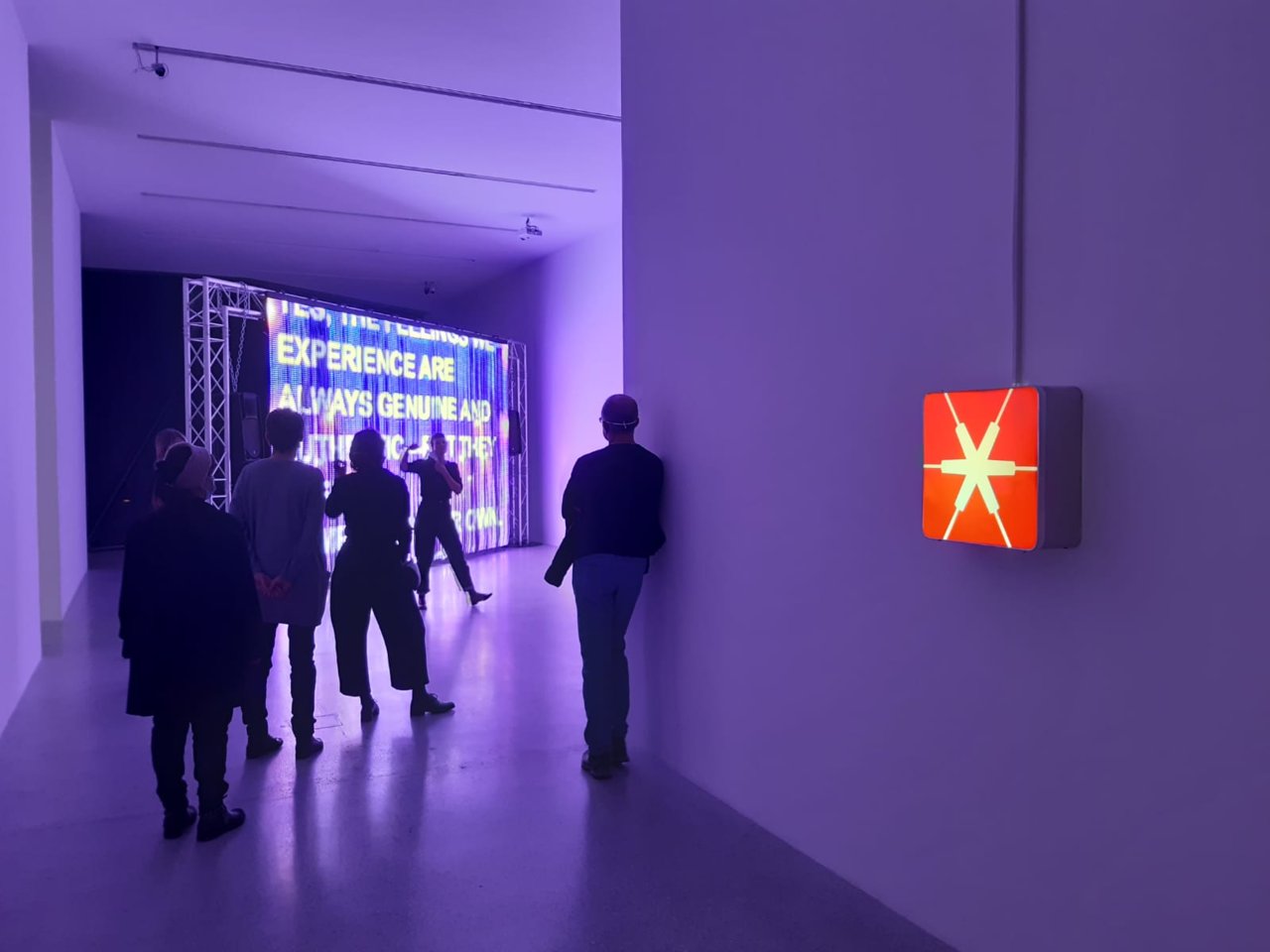 Das Durchschreiten eines leuchtenden LED-Vorhangs, dessen bunte Fläche wie ein riesiger Bildschirm mit fließenden Bildern und Sound bespielt ist, hüllte uns in Träume, Sehnsüchte und Nostalgien. Ein extrem poetisches Werk, das zu sehr Vielem einlädt.