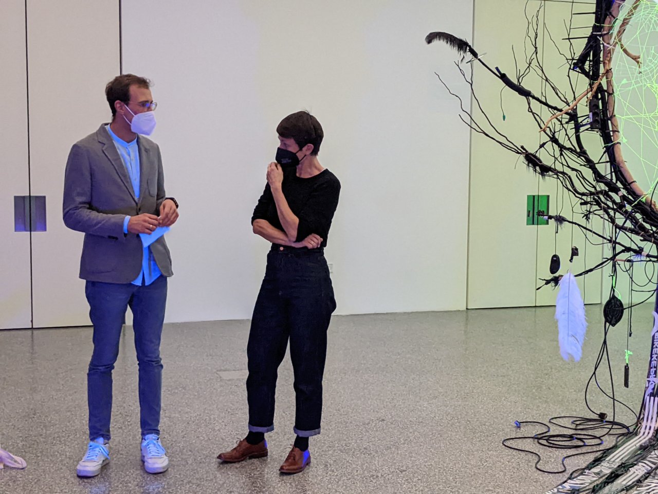 Heuer überlegte sich Direktorin Heidi Hintner für ihr Kollegium etwas Besonderes und lud alle ins Museion zur Ausstellung „Techno“ ein; ein Eintauchen in immersive Werk-Situationen aus Licht, Sound & Bewegung. Sie konnte die Museumspädagogin Brita Köhler, mit der die Schule schon öfters zusammengearbeitet hat, und den jungen Kollegen Julian Stuefer gleich für ihre Idee gewinnen: Brita Köhler führte durch die Ausstellung, erklärte die Werke und gab einige Handlungsanregungen; Religionslehrer Julian Stuefer überraschte seine Kolleginnen und Kollegen mit einem Text und trat in einen kurzen Dialog mit der Kunst.