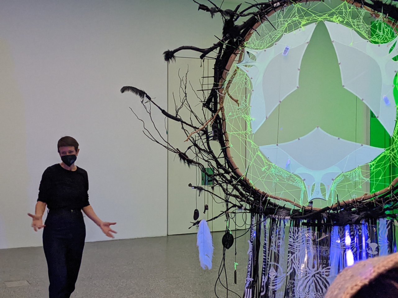 Vor einem raumhohen, riesigen Traumfänger – gefertigt aus Resten unserer Zivilisation wie Computer-Mäuse, Kabel, Plastik-Müll, Cd-Roms, Marken und Logos von großen Kommerzgiganten – überlegten wir, was wir aktuell nicht haben wollen, was wir eliminieren und wovon wir uns beschützen wollen. An dieser Stelle verlas Julian Stuefer seinen Text.