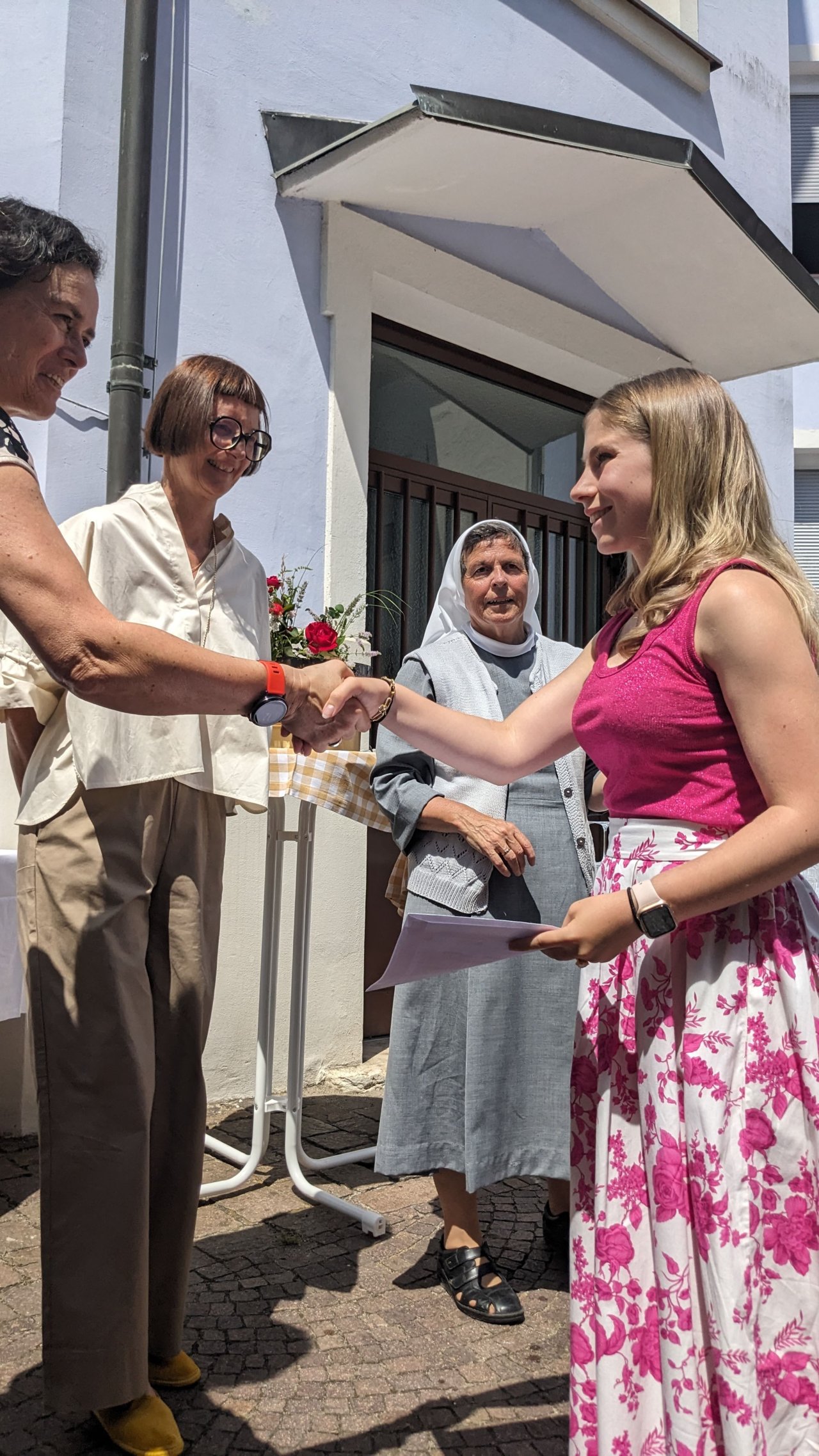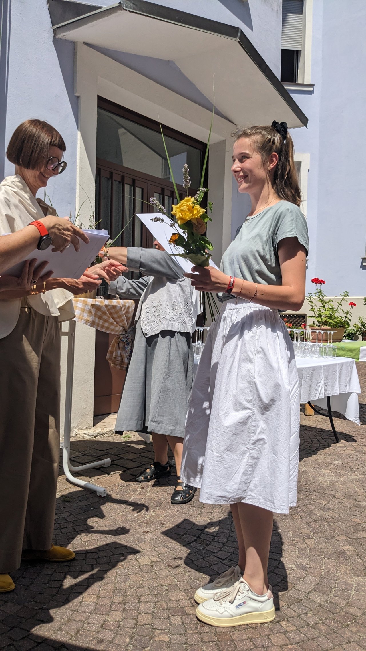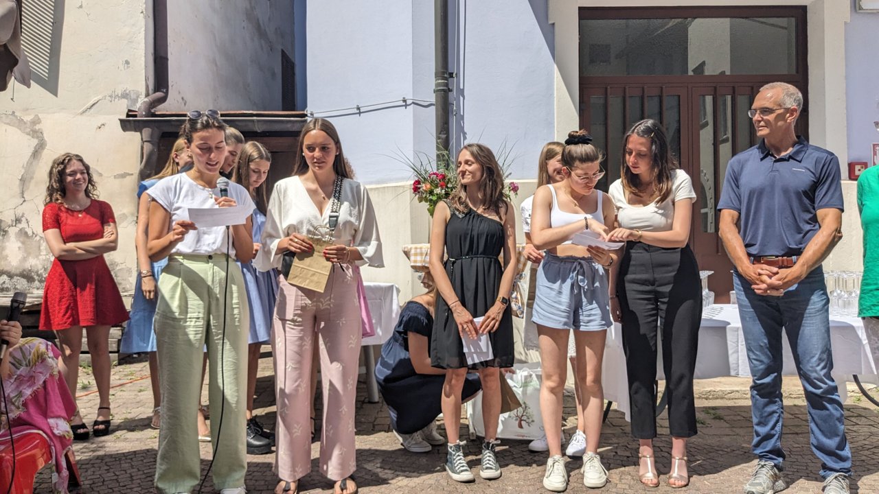 „In die Welt geleitet“, formulierte Direktorin Heidi Hintner in ihrer Rede im Schulhof und griff dabei Hannah Arendt auf. Hintner bedankte sich bei den Eltern, bei den Lehrpersonen, beim Schulpersonal, bei der Maturakommission und gratulierte allen Absolventinnen zum sehr guten Ergebnis.