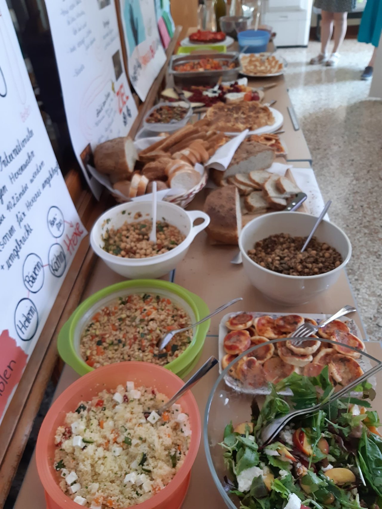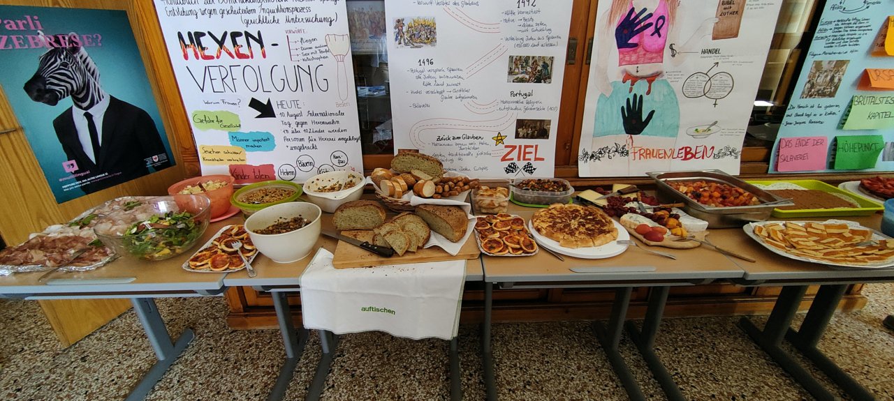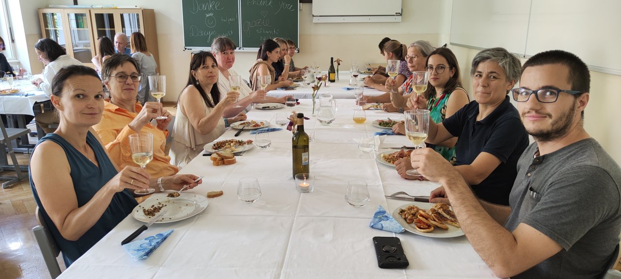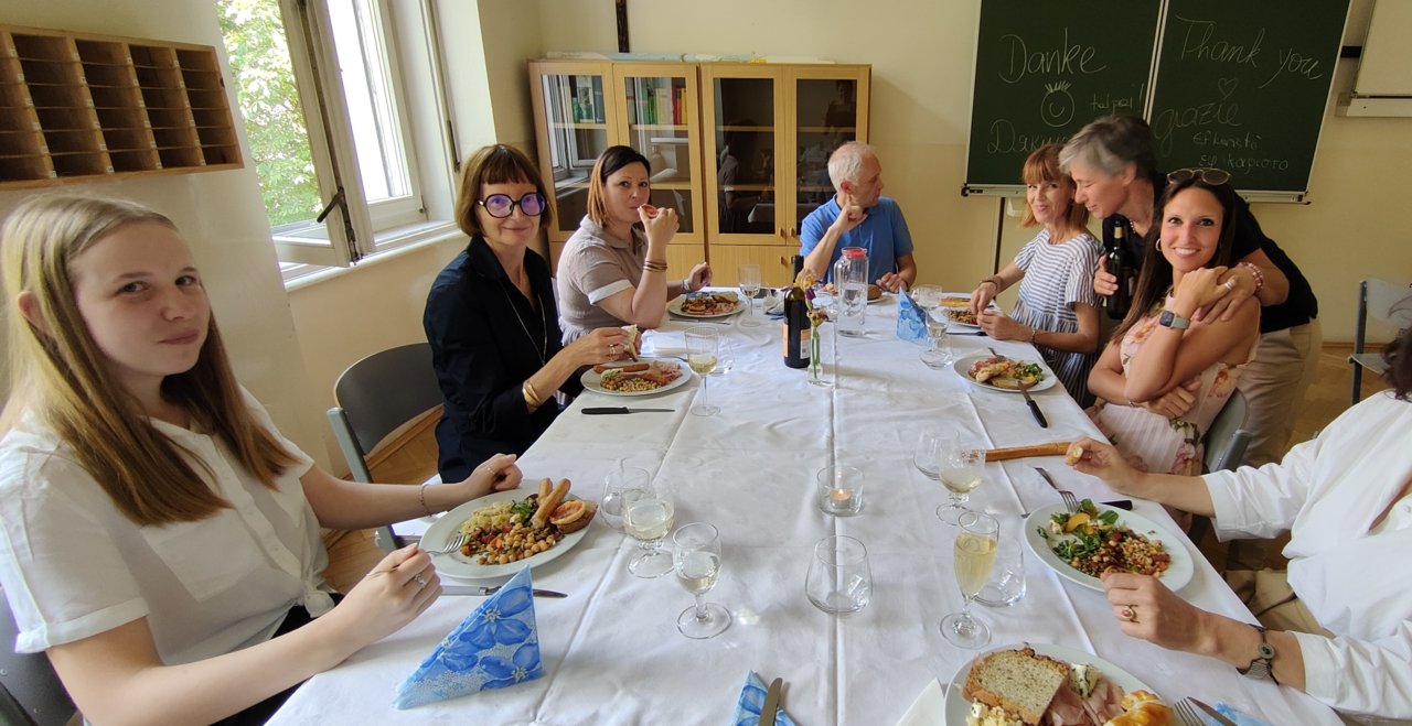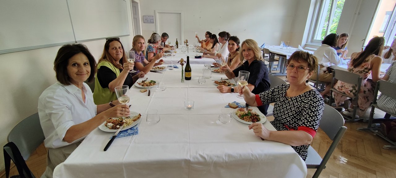 Nach den Abschlusskonferenzen verwandelten wir die Klassenräume in ein Restaurant: schöne Atmosphäre, chillige Musik, köstliches und selbst zubereitetes Essen, ein gutes Glas Wein dazu und die Gesellschaft der Kolleginnen und Kollegen.