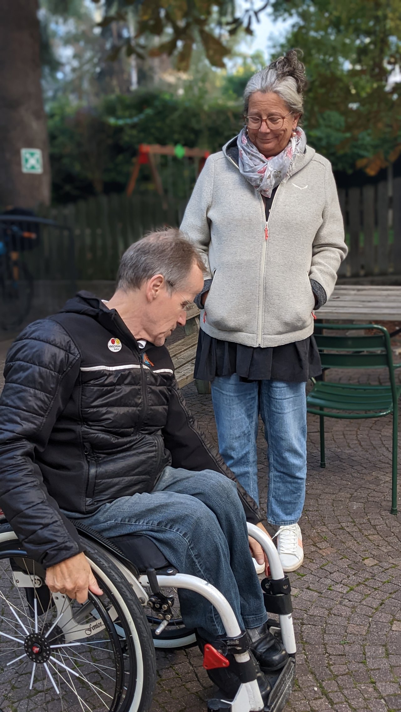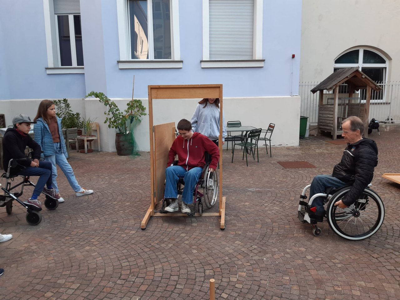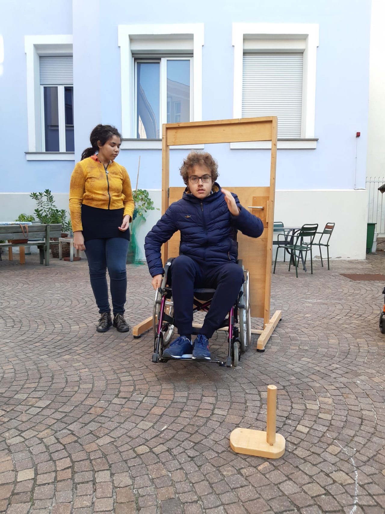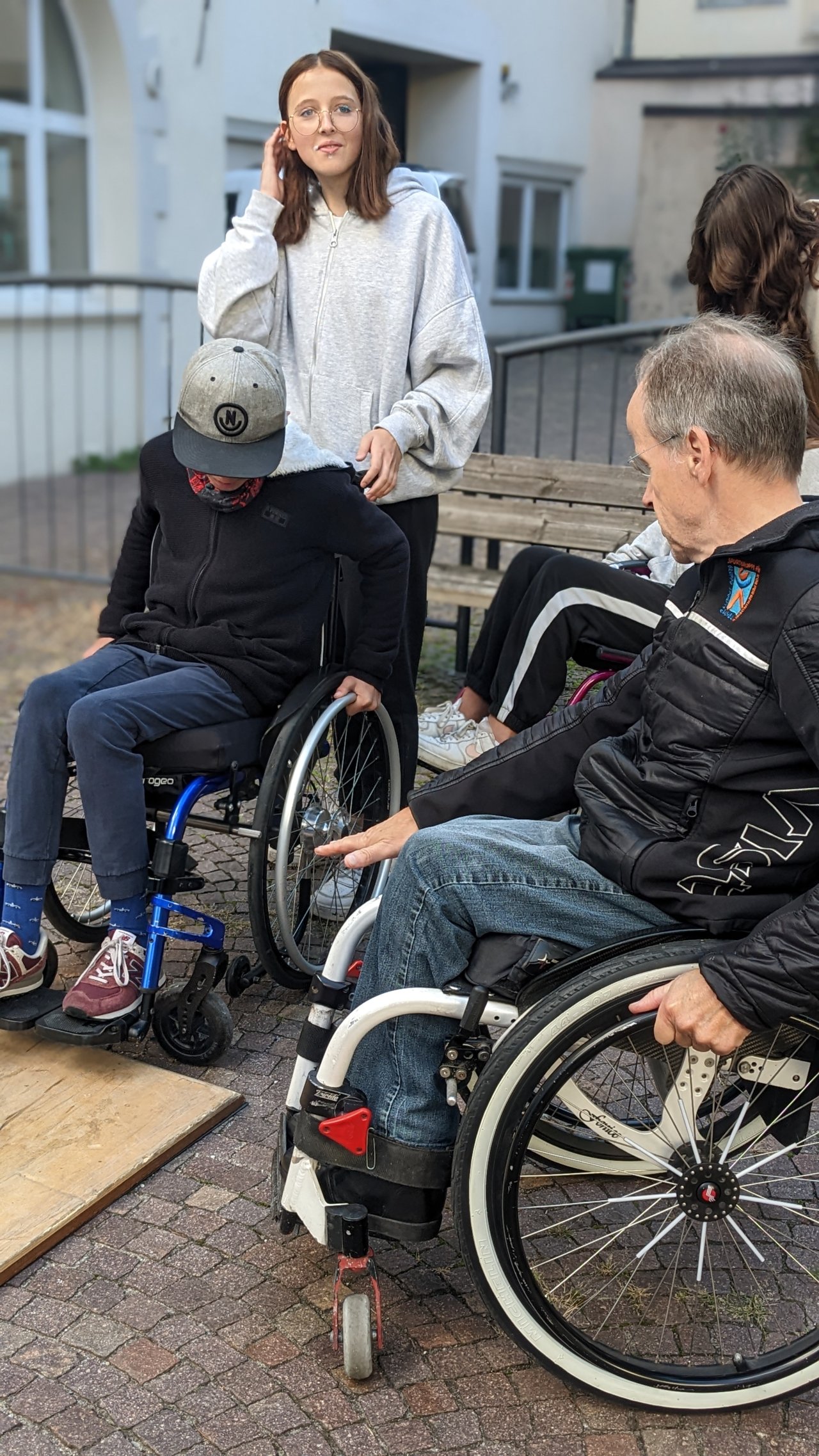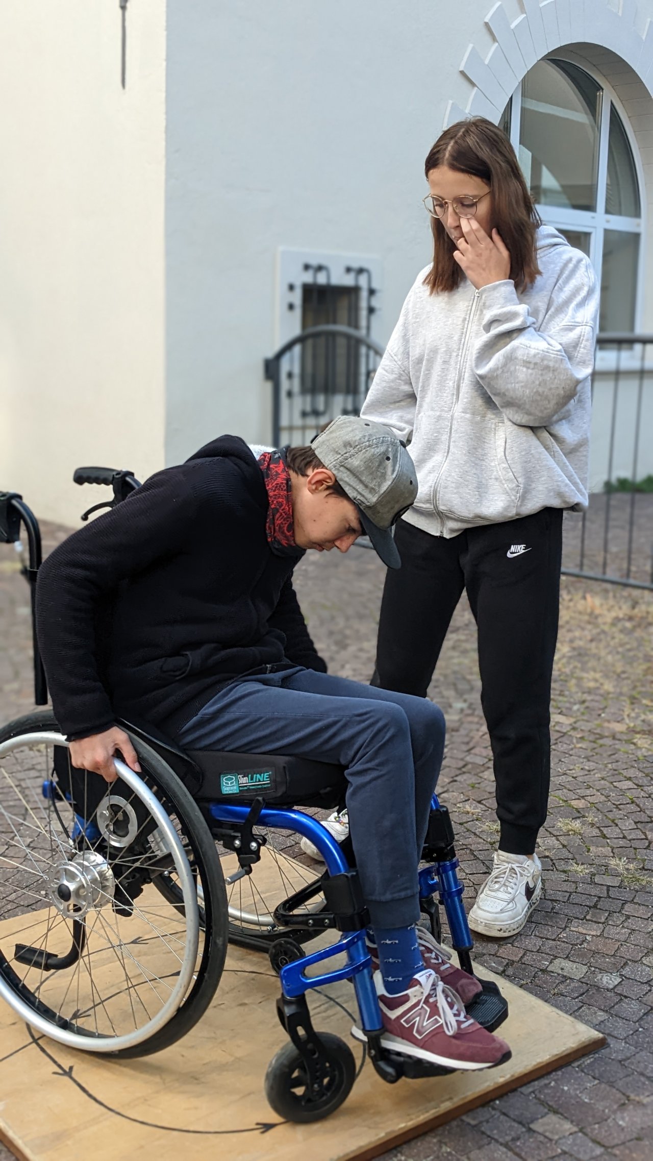 Die Schülerinnen und Schüler mussten einen Slalom bewältigen, über eine kleine Wippe fahren, wenden und drehen, eine Tür öffnen. Sie waren jeweils im Tandem unterwegs, um sich gegenseitig zu unterstützen und zu helfen oder um nicht nach hinten zu kippen. Dann wurden die Rollen getauscht.