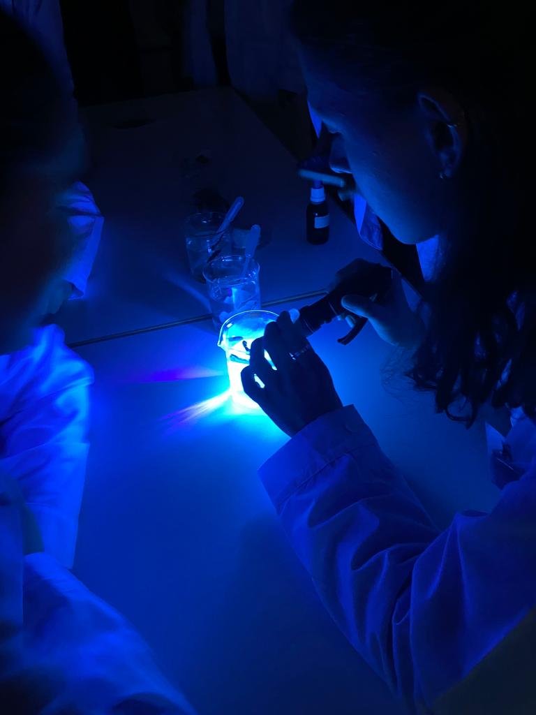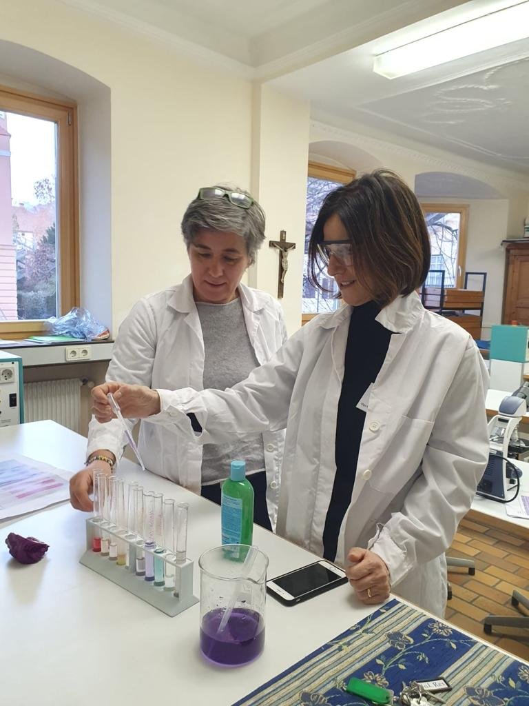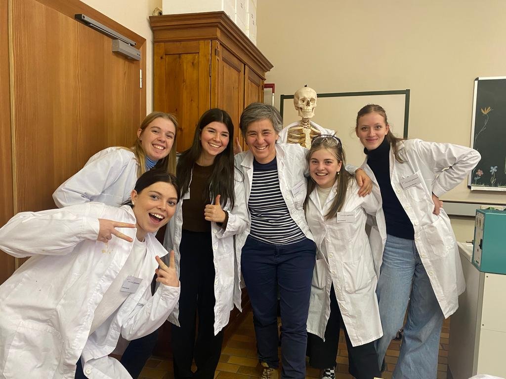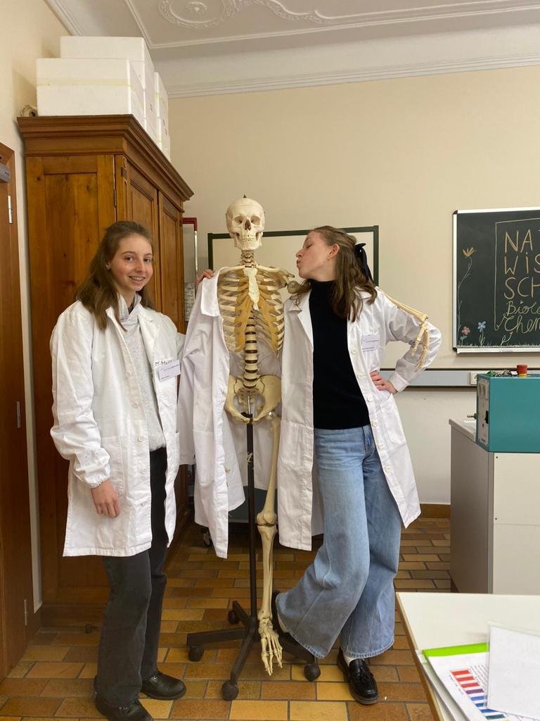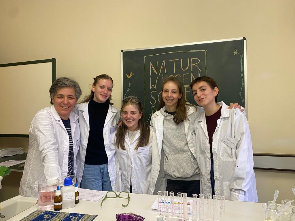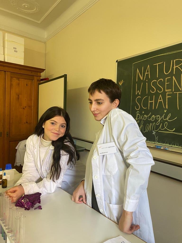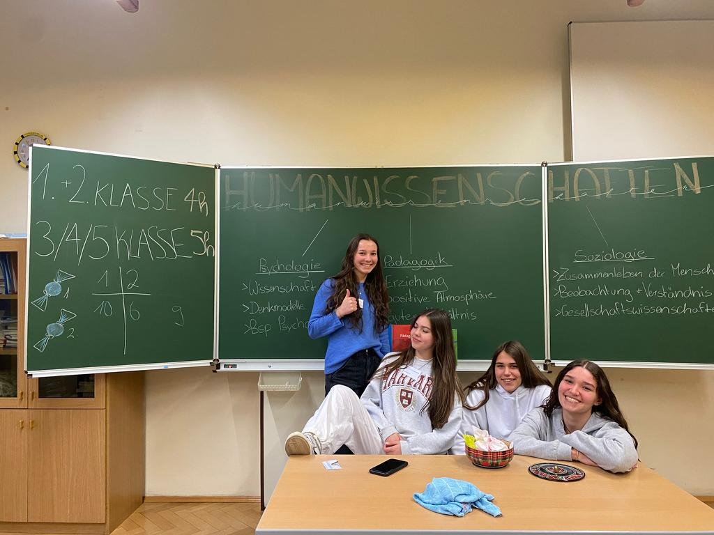 Die 3. Klasse des MHGs organisierte und gestaltete zwei Nachmittage für Mittelschüler*innen: zum Austauschen, Nachfragen und Ausprobieren. Während die Eltern von Direktorin Heidi Hintner und Vizedirektorin Karin Langebner Informationen und eine kleine Einführung in die Schule bekamen, wurden die Mittelschüler*innen von vier Mädchen des MHGs durch das Schulgebäude geführt. An vier Stationen, konnten sie durch Spiele und Versuche in den Fächern Humanwissenschaften, Latein, Englisch und Naturwissenschaften eine etwas konkretere Vorstellung über den Unterricht am MHG bekommen. Im Chemielabor der Schule wurden so beispielsweise Steine zum Sprudeln und Stöcke zum Leuchten gebracht. Vorbereitet wurden die Schnuppernachmittage von der 3. Klasse, mit Unterstützung der jeweiligen Fachlehrpersonen.