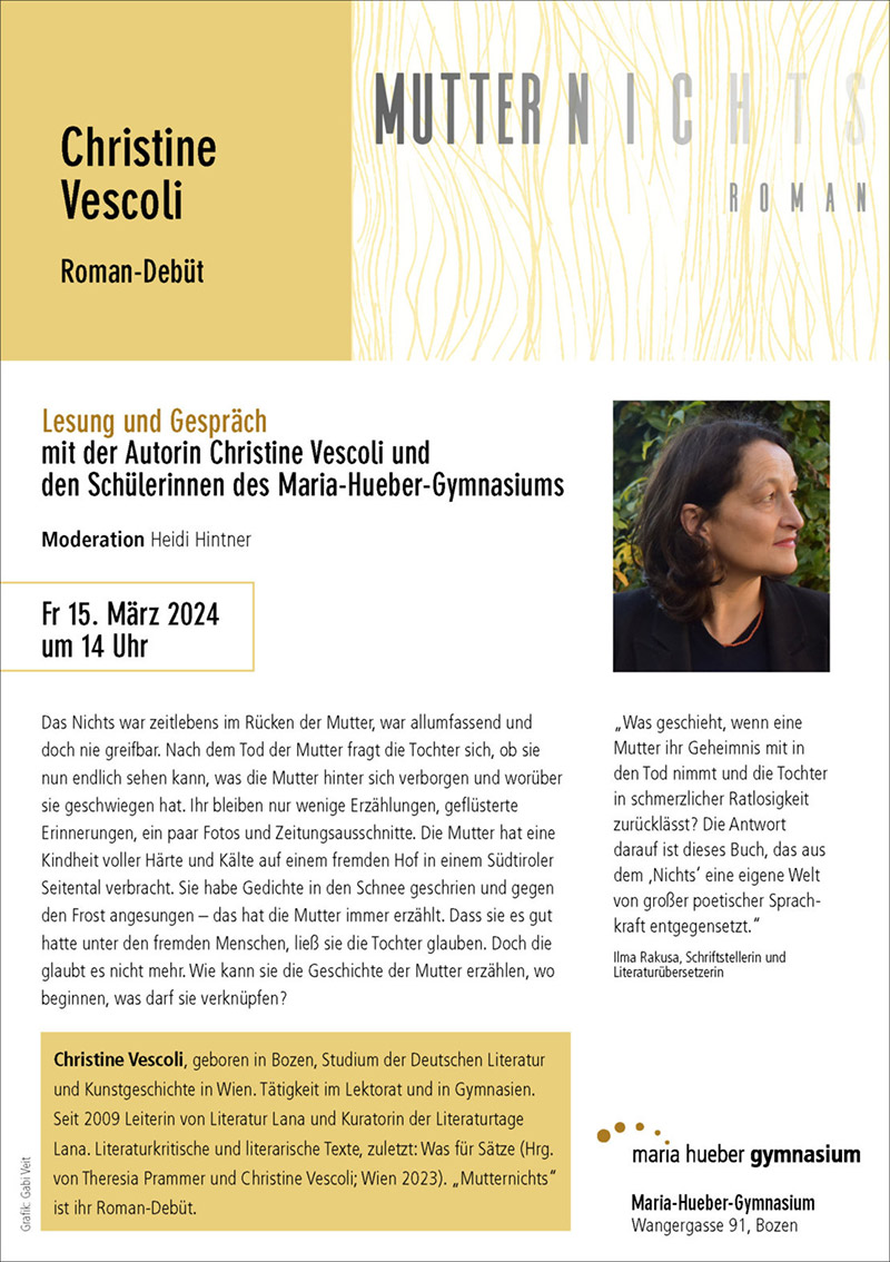 von Christine Vescoli Wir gratulieren Christine Vescoli sehr herzlich zum Roman-Debüt "Mutternichts".Am 15. März liest die Autorin aus ihrem Buch der vierten und fünften Klasse vor und beantwortet die Fragen der Schülerinnen.